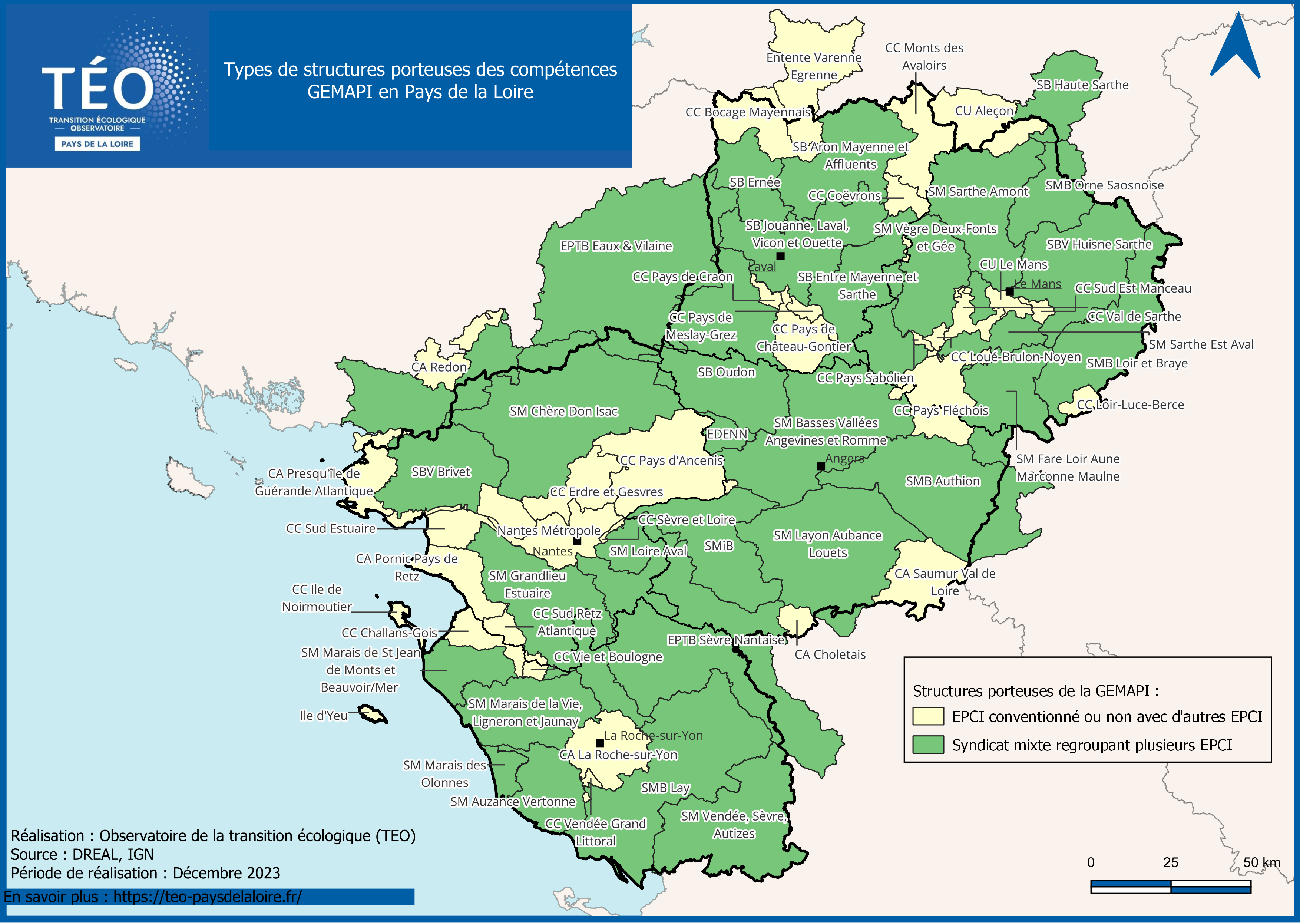 Cette cartographie s’adresse à un public connaisseur de la thématique GEMAPI et met à disposition la donnée pour une analyse approfondie. Pour apporter un éclairage sur la répartition de l’exercice de la GEMAPI et élargir le public cible de cet article, TEO propose un découpage simplifié des structures porteuses de la GEMAPI en Pays de la Loire. La carte ci-dessous présente les établissements publics (Syndicats Mixtes, EPTB …) habilités à exercer les compétences GEMAPI, et à défaut les EPCI qui l’exercent.
