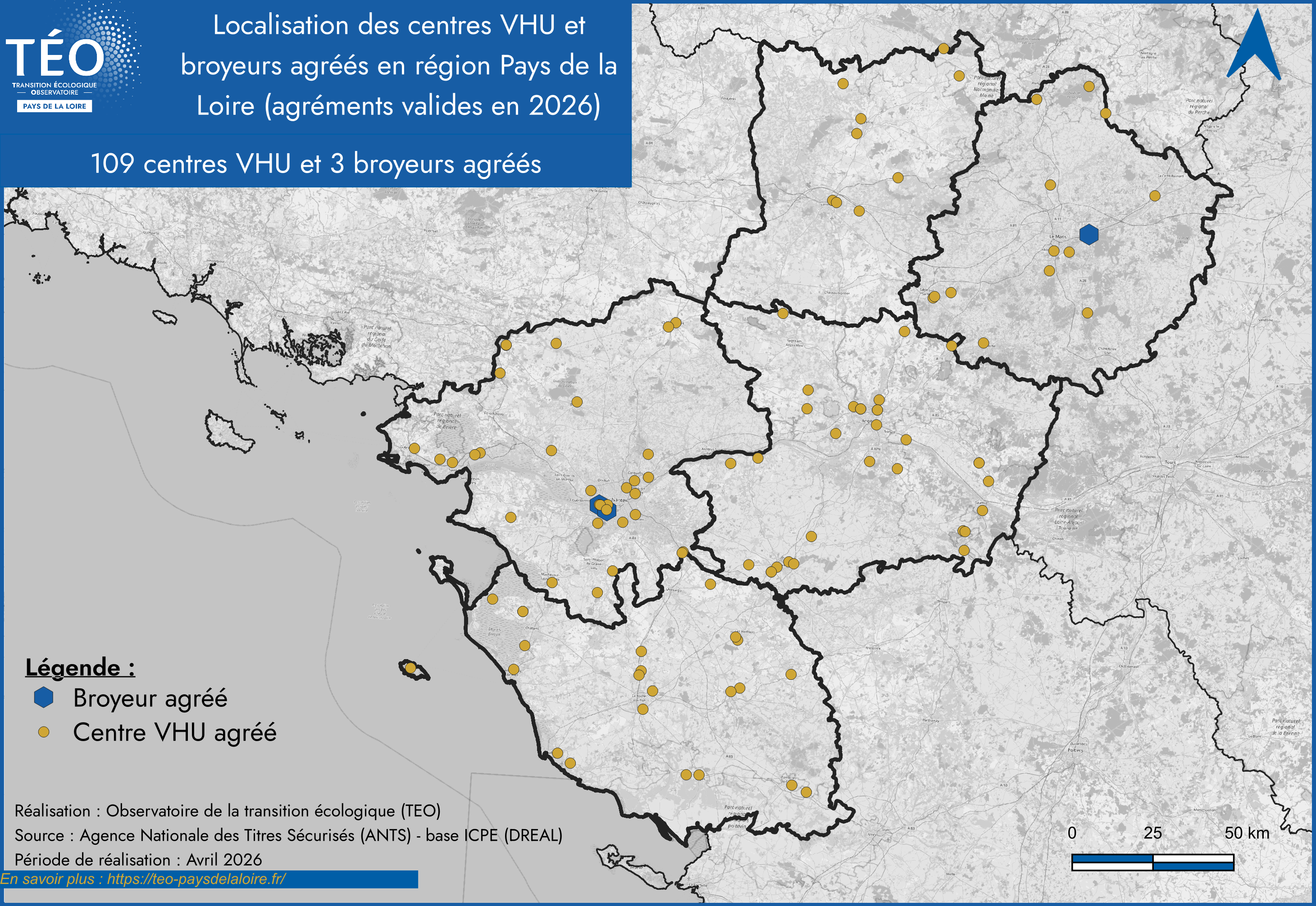 3 broyeurs agréés sont également présents sur le territoire régional : 2 en Loire-Atlantique et 1 en Sarthe qui sont également des centres VHU agréés.