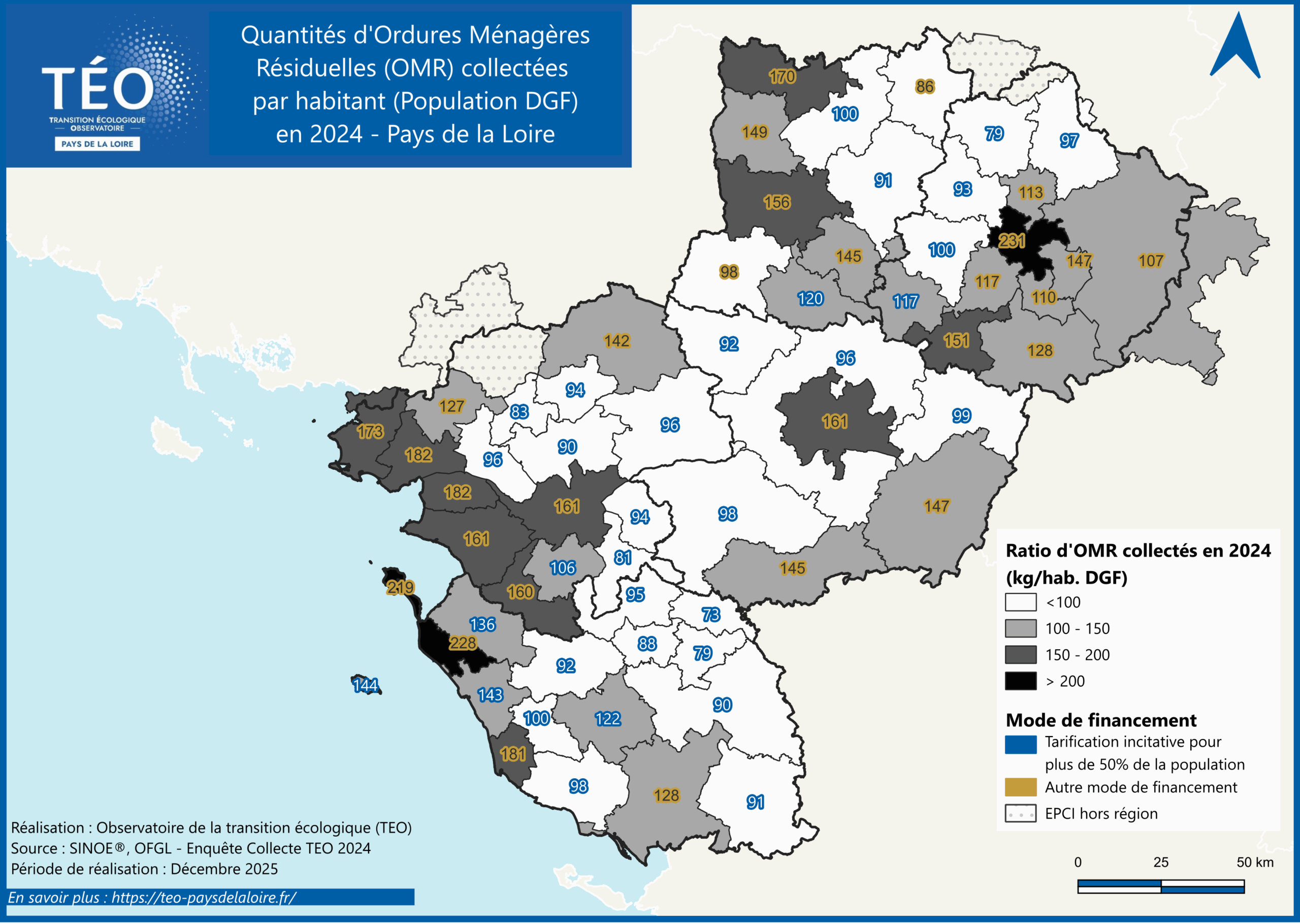 En 2024, la production moyenne d’Ordures Ménagères résiduelles par habitant (OMr) en Pays de la Loire est de 139,4 kg/hab DGF /an.
