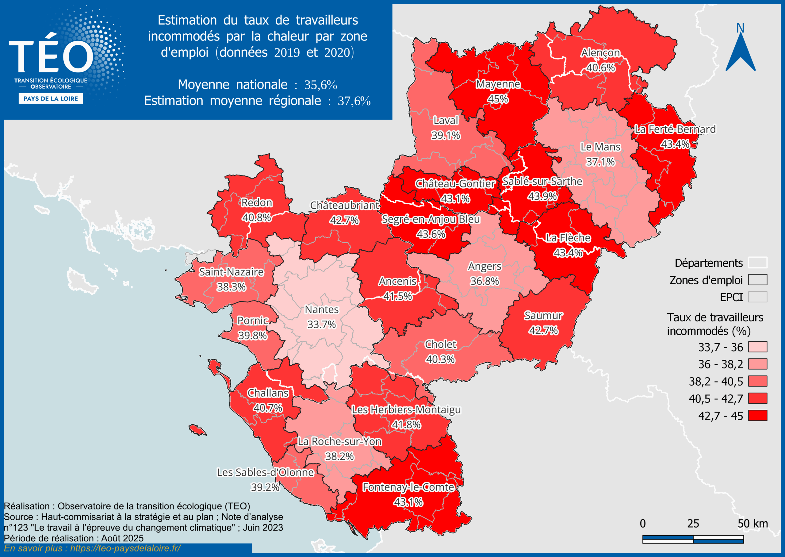 Le GIEC Pays de la Loire travaille sur cette thématique, et plus spécifiquement avec un focus sur les travailleurs et l’emploi, le secteur agro-alimentaire et le tourisme, tel que détaillé dans la note de cadrage du groupe de travail « Quels impacts sur l’économie régionale à l’horizon 2050 ? ». La publication de cette étude est attendue pour 2025. Il n’existe à notre connaissance pas d’autres études détaillées au niveau régional.